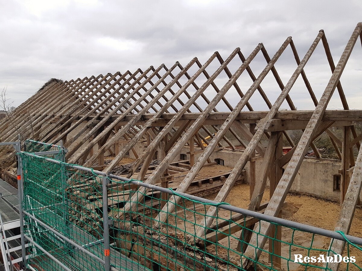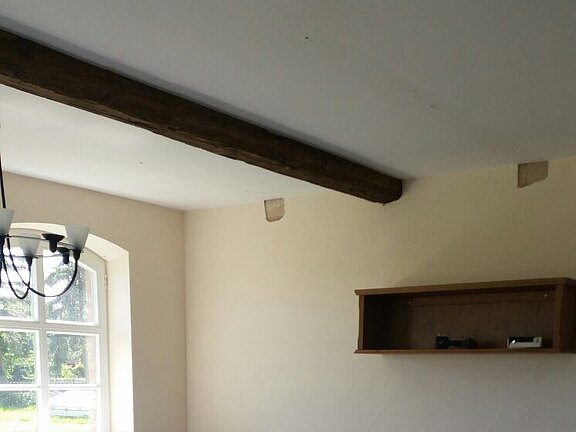 Mittels einer Nylonbürste werden die alten Schmutzablagerungen von den Balken gebürstet, somit kommt die Balkenstruktur wieder zum Vorschein.