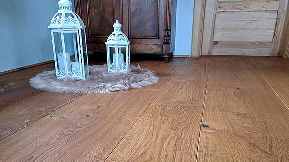 Eine Massivholzdiele ist pflegeleicht. Je nach Oberfläche reicht regelmäßiges Fegen und gelegentliches Nachölen oder -wachsen aus, um ihre Schönheit zu bewahren.