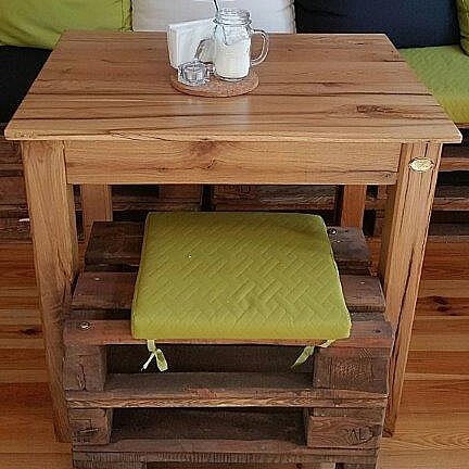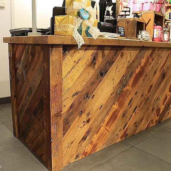 Pour la présentation de vos produits, nous fabriquons des meubles et des décorations en bois de récupération, comme des étagères et des comptoirs ainsi que des tables d'exposition.