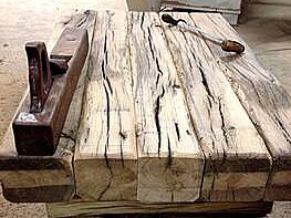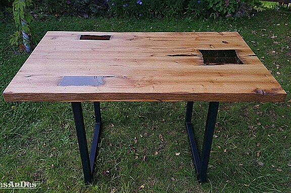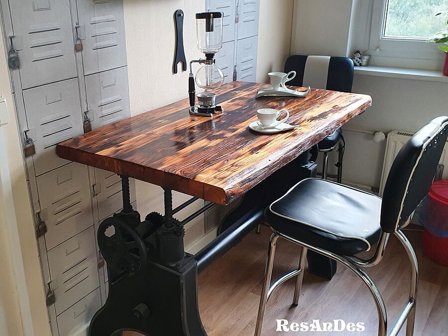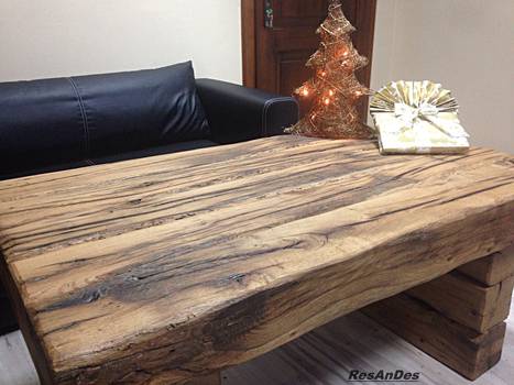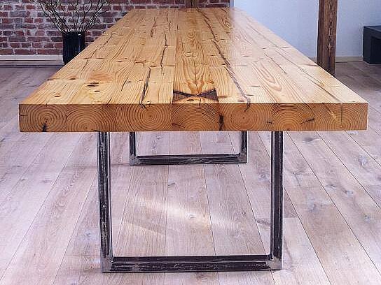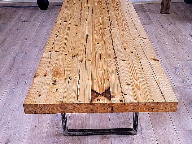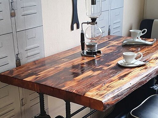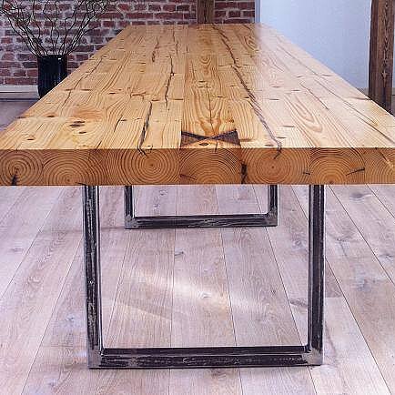 - tables de salle à manger, de salon ou de restaurant en vieux planches de chêne ou de conifères et en poutres