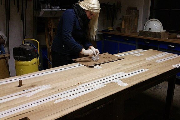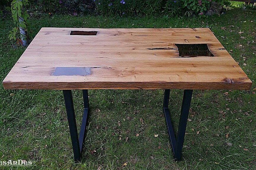 - plateaux de table en poutres découpées avec fissures coulées en résine époxyde