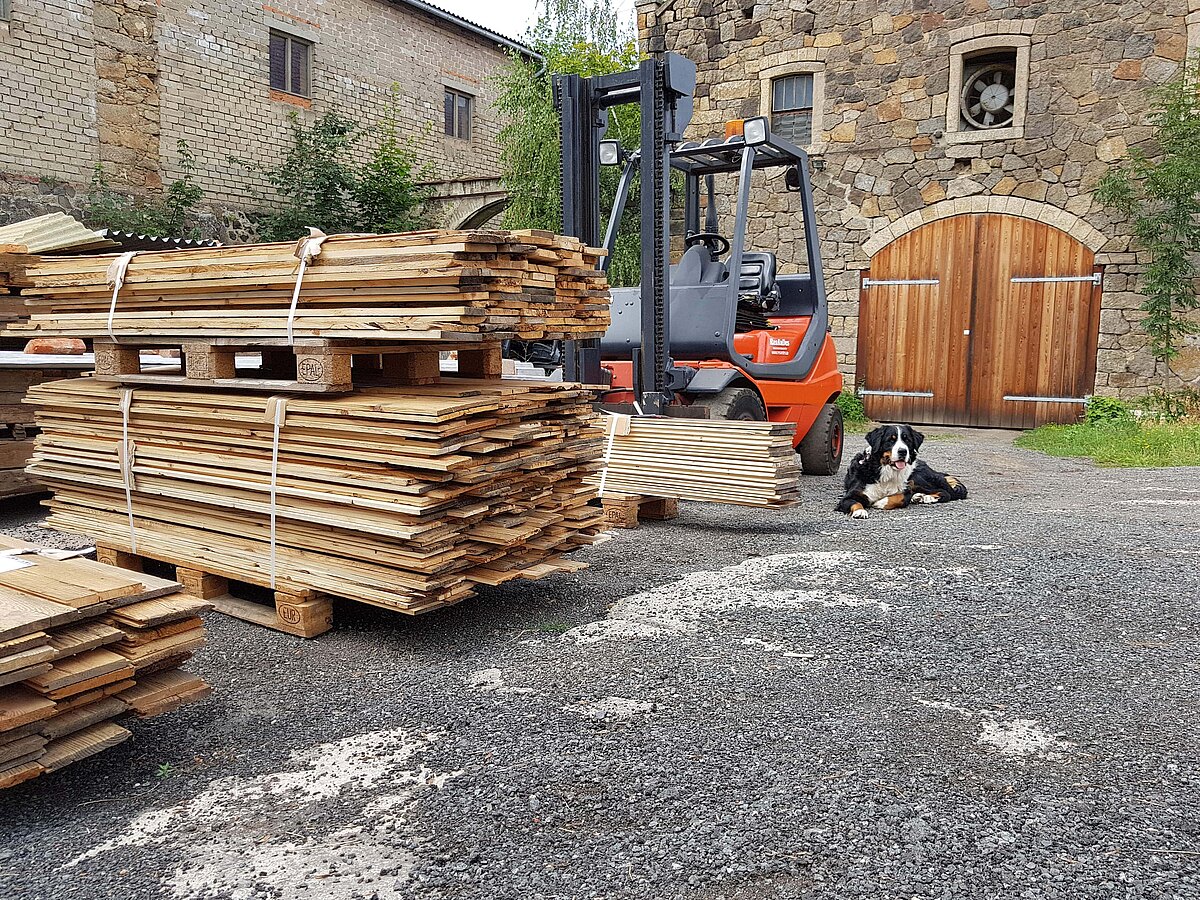Unsere Altholzbretter, Balken, Granitplatten und Ziegel erhalten Sie auf Paletten verpackt per Spedition.